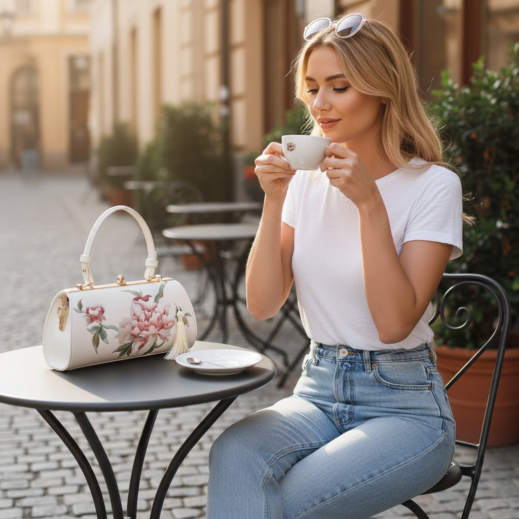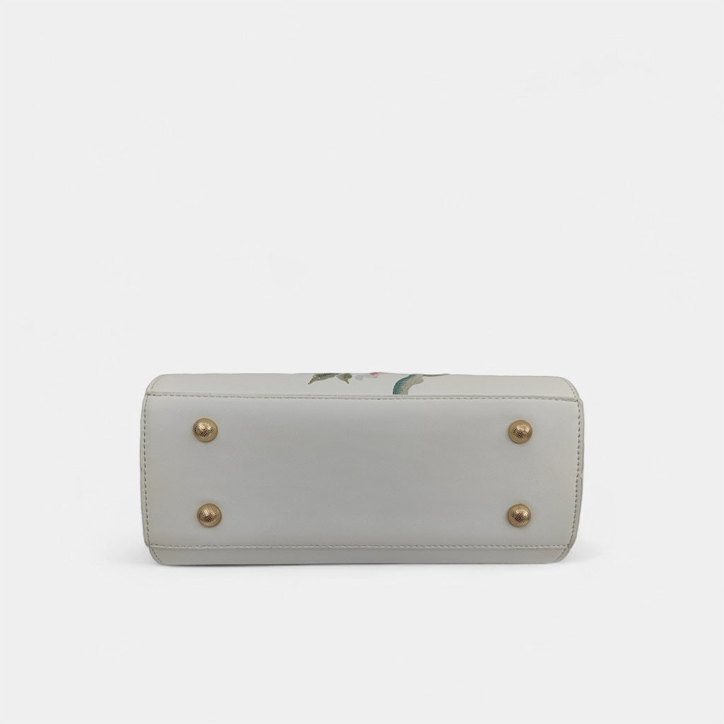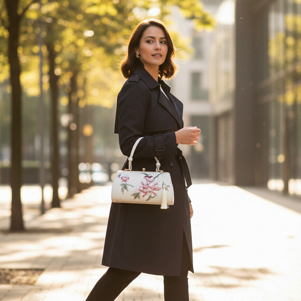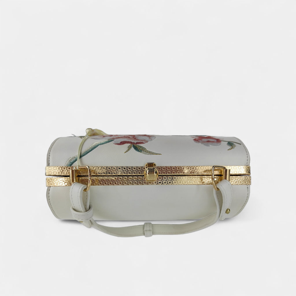 Designer Floral Handbag | White Vintage Embroidered Peony Barrel Bag with Tassel
